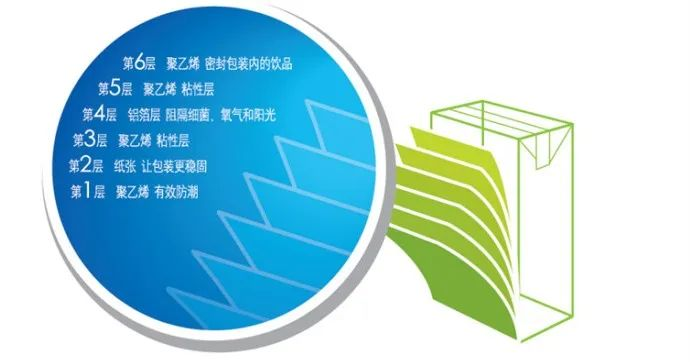 紙鋁塑復(fù)合材料由紙、鋁、聚乙烯組成的六層復(fù)合而成。紙板是其中的主要材料,提供了包裝的穩(wěn)定性、強(qiáng)度及印刷面的平滑度;聚乙烯能夠阻擋外部的濕氣,并使紙板粘合在鋁箔上;鋁箔能夠有效阻隔空氣和光線,避免細(xì)菌污染食品。