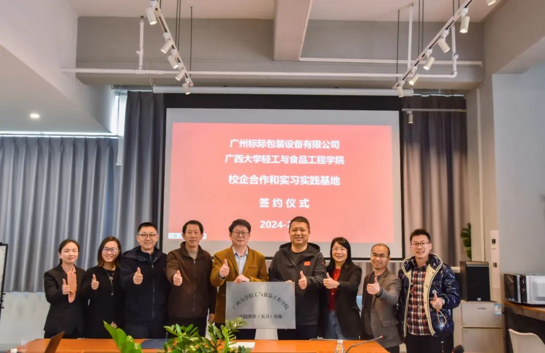▲雙方合影留念2024年2月29日,廣西大學(xué)輕工與食品工程學(xué)院與GBPI 標(biāo)際在廣州標(biāo)際總部舉行了校企合作和實習(xí)實踐基地簽約儀式。廣西大學(xué)輕工與食品工程學(xué)院書記姜瑋、包裝工程專業(yè)負(fù)責(zé)人黃崇杏、系副主任