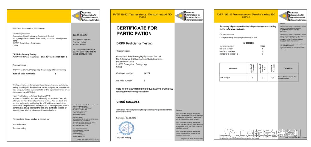 廣州標際檢測技術有限公司積極參加國際能力驗證,近日又獲喜報,在2019年參加德國DRRR組織的“耐撕裂力測定”“摩擦系數測定”“透光率/霧度測定”四個項目的國際實驗室能力驗證中獲得滿意結果!表明標際檢