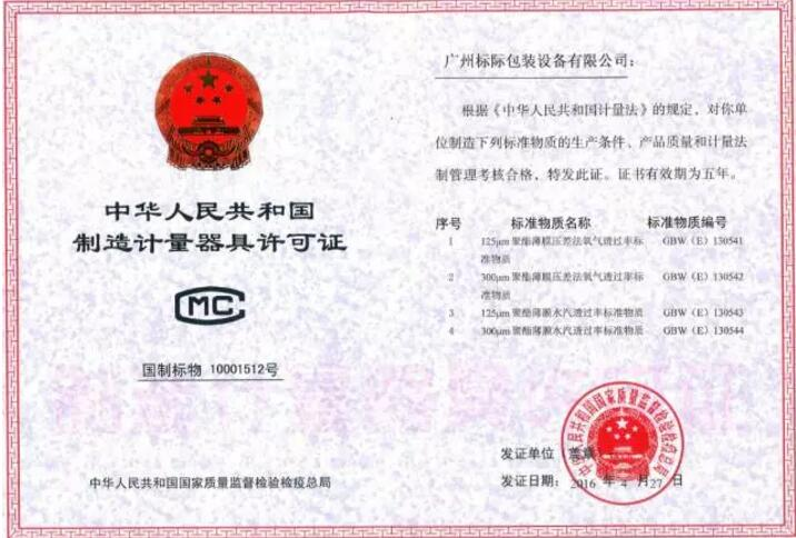 氣體透過率,水汽透過率國家標(biāo)準(zhǔn)物質(zhì)制造計(jì)量器具許可證——廣州標(biāo)際(GBPI)