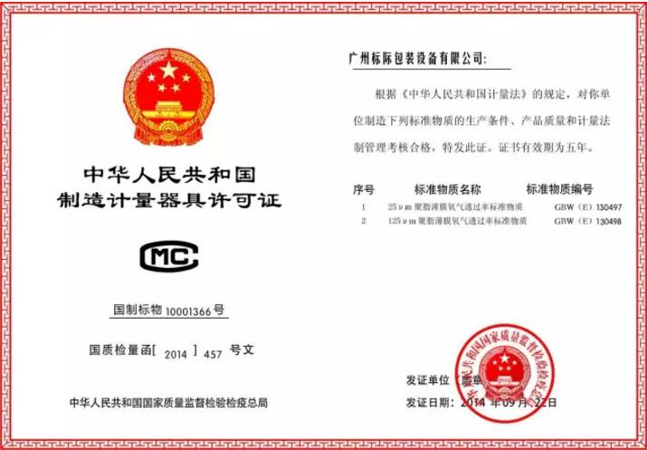 氧氣透過率國家標(biāo)準(zhǔn)物質(zhì)制造計(jì)量器具許可證——廣州標(biāo)際(GBPI)