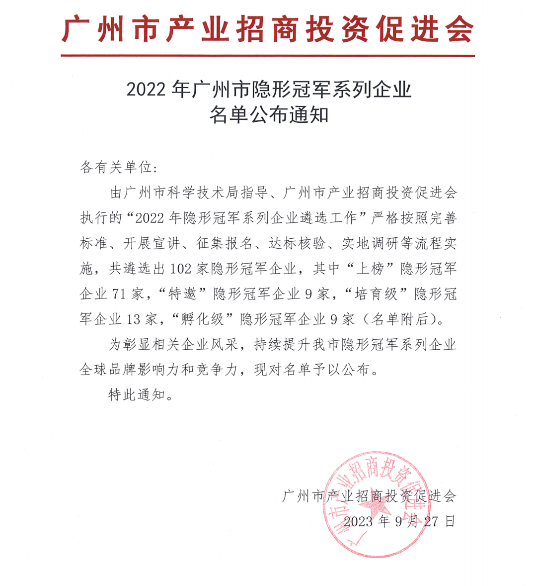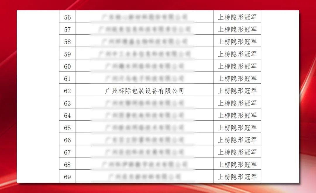發布時間:2023-10-17為深入貫徹習近平總書記“關于打造更多隱形冠軍”的重要指示精神,落實省市黨委政府及《廣州市國民經濟和社會發展第十四個五年規劃和2035年遠景目標綱要》《廣州市科技創新“十四五”規劃》關于“發掘一批創新能力強、行業地位高、盈利水平好的隱形冠軍企業”的相關要求,由廣州市科學技術局指導、廣州市產業招商投資促進會執行的“2022年隱形冠軍系列企業遴選工作”嚴格按照完善標準、開展宣講、征集報名、達標核驗、實地調研等流程實施,最終“上榜”隱形冠軍企業僅有71家。廣州標際包裝設備有限公司榜上有名,榮獲“上榜”隱形冠軍企業。